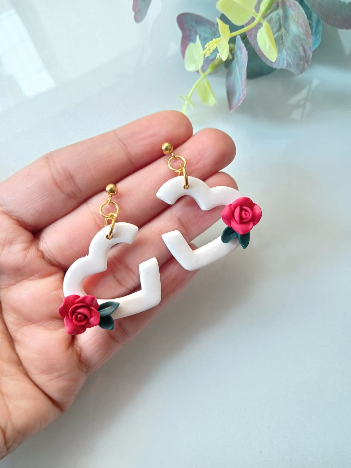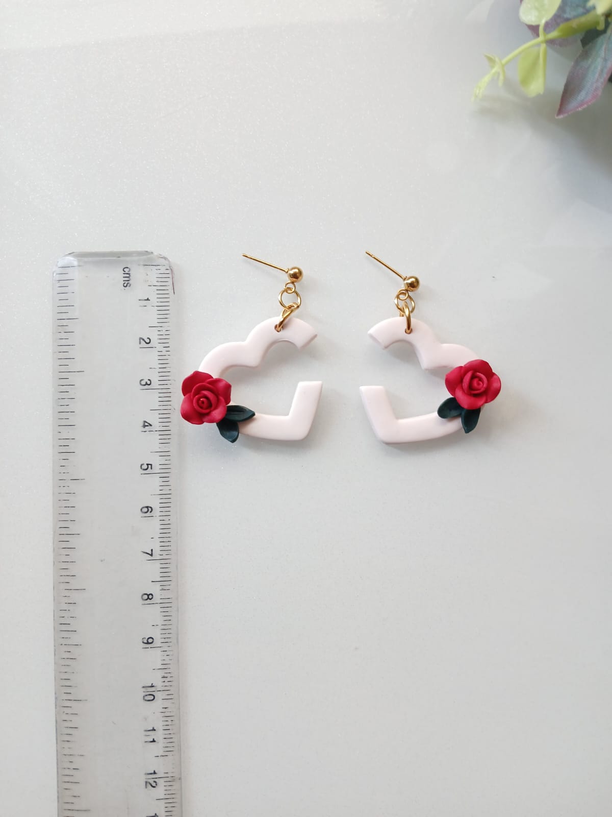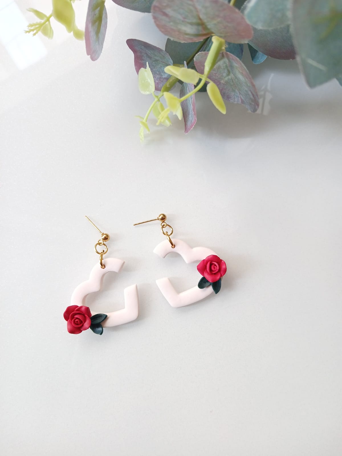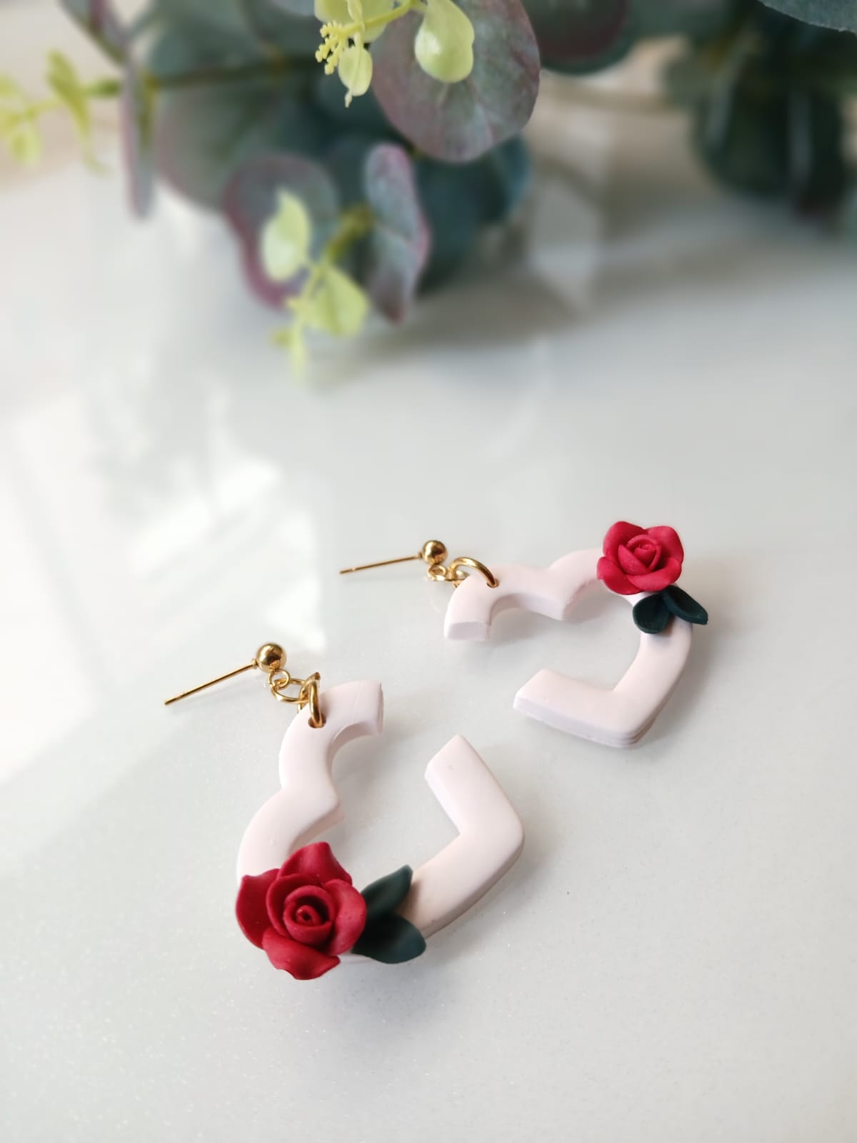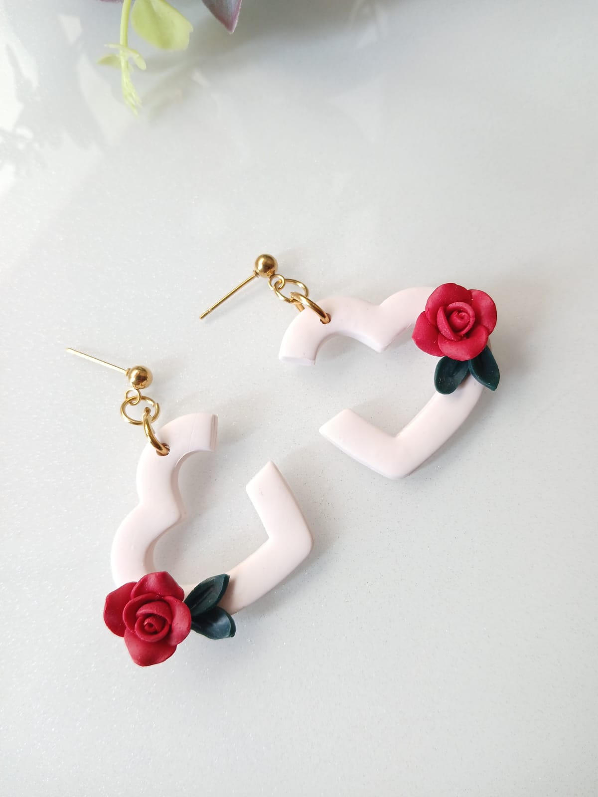 Handmade blush pink heart hoop earrings featuring a delicate sculpted red rose. Lightweight, elegant, and perfect for everyday or romantic wear.