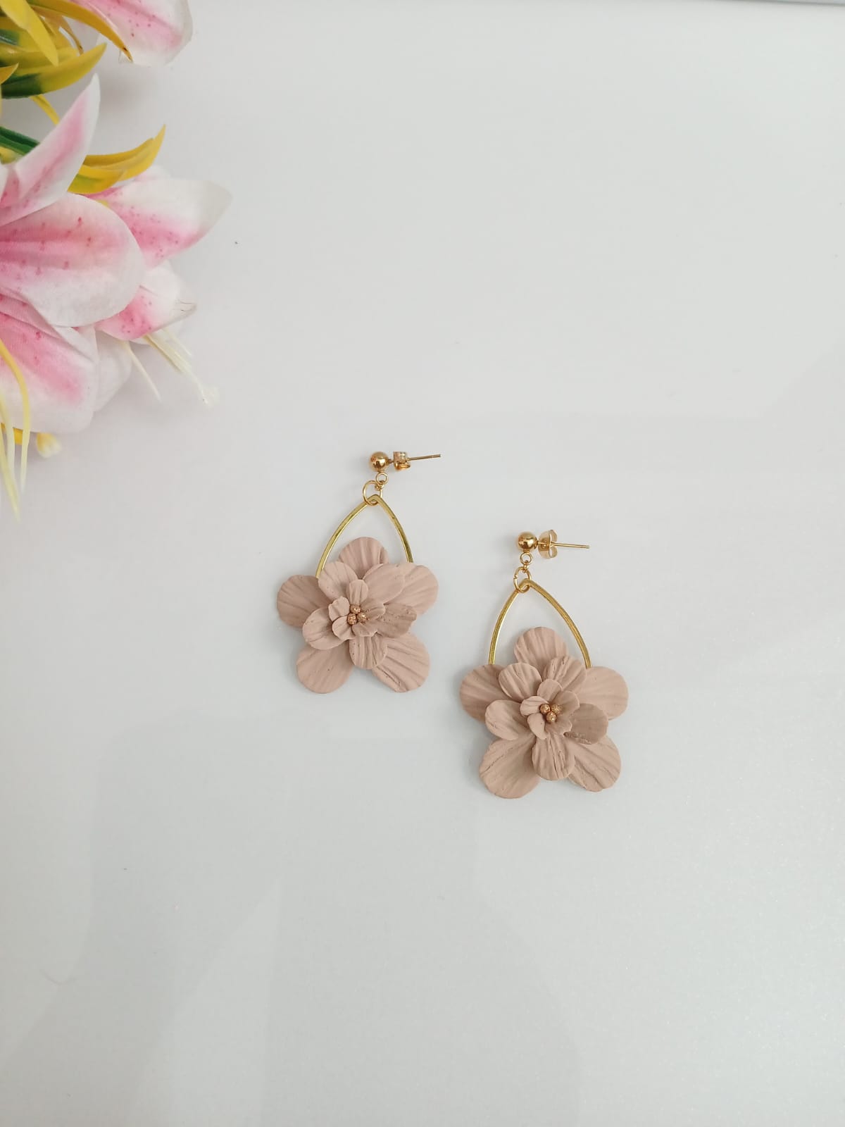 Handcrafted from high-quality polymer clay, these floral earrings feature delicate, sculpted petals designed to capture the beauty of nature in full bloom. Lightweight and comfortable for all-day wear, each pair is uniquely made, offering a timeless, feminine touch to any outfit.