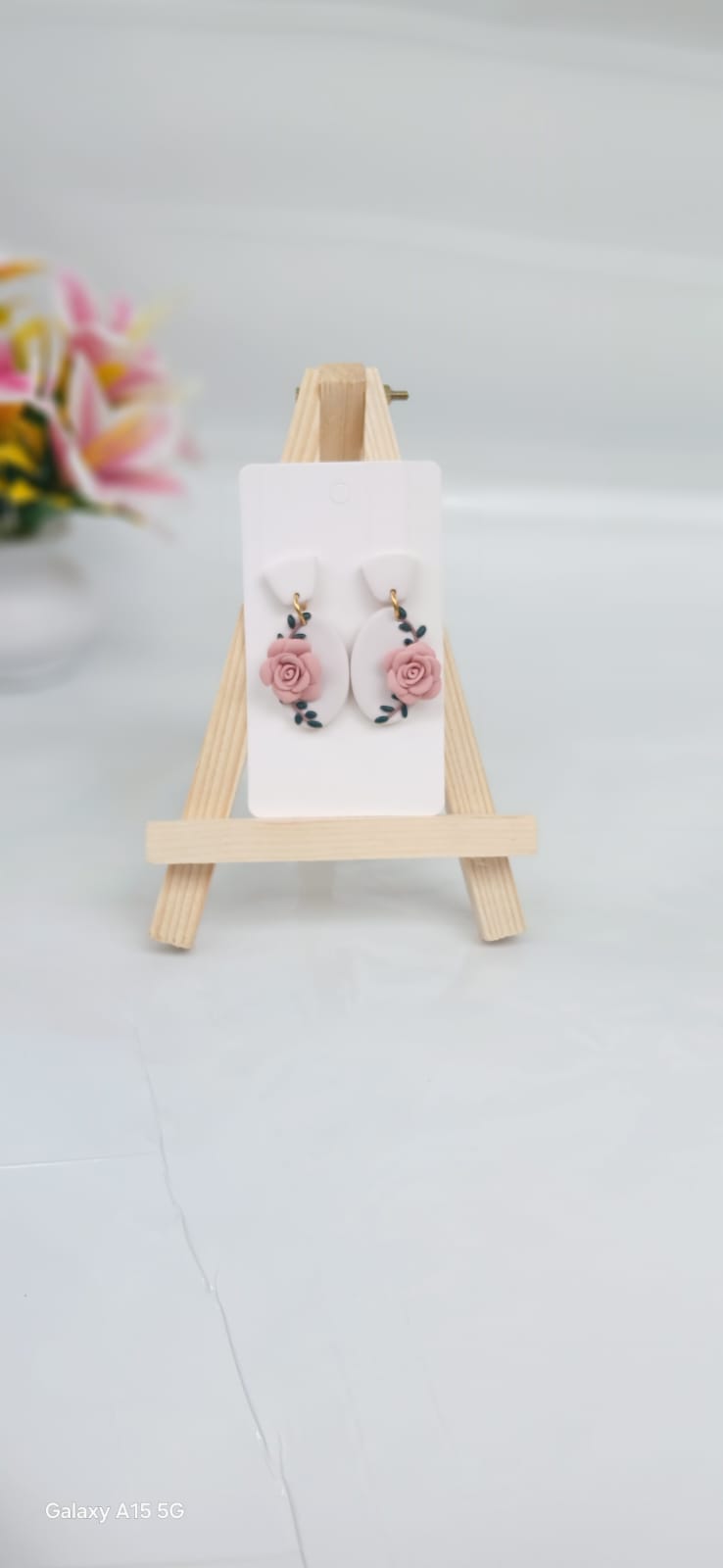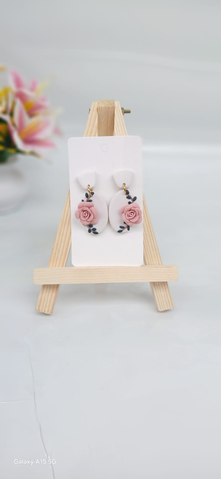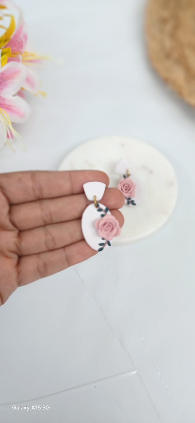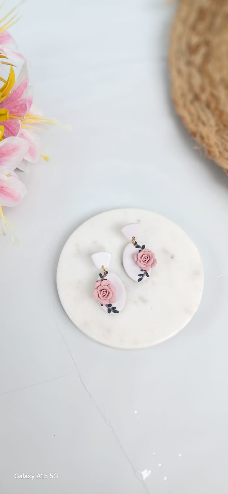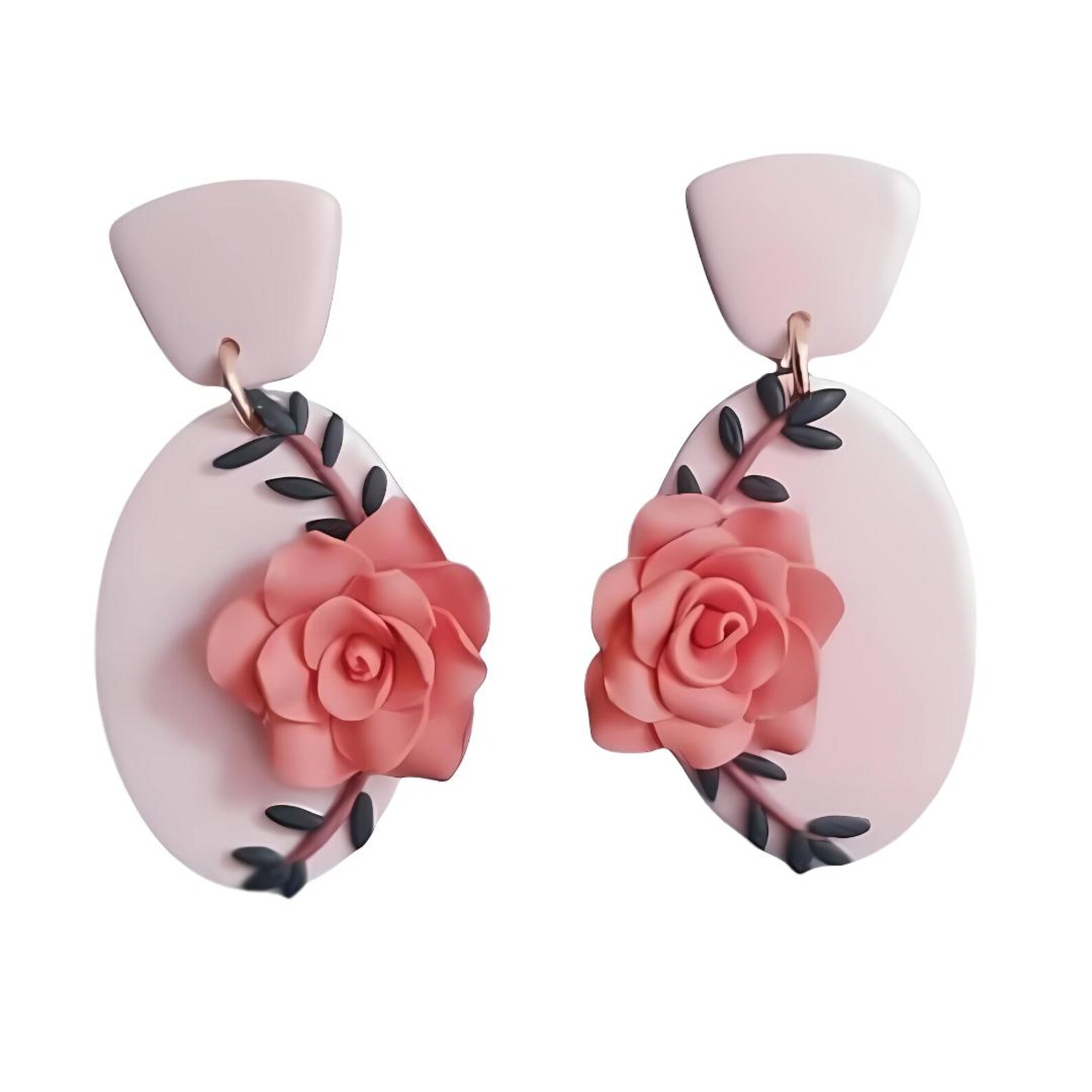 Add a touch of romantic elegance to your jewellery collection with these exquisite handcrafted clay earrings. Each pair is beautifully detailed with soft coral pink roses, delicately set against an oval-shaped white backdrop. The floral design is enhanced with graceful black leaf accents, creating a stunning botanical composition with timeless appeal.