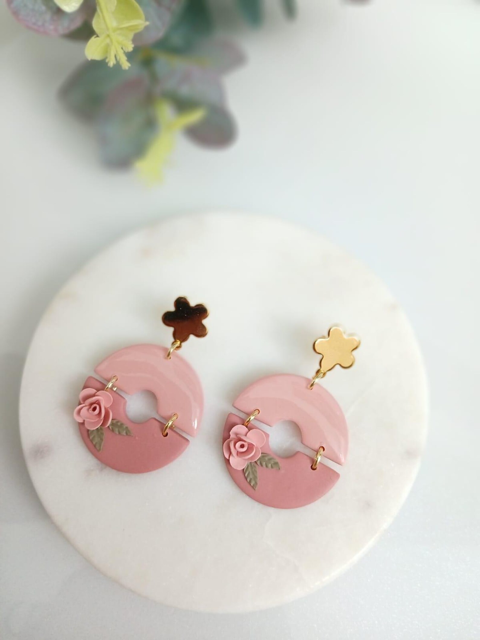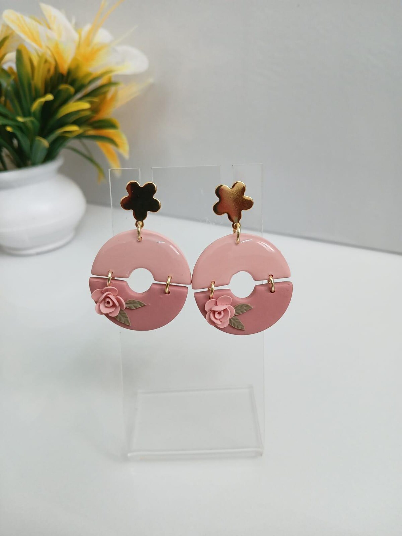 Handmade Pink Floral Hoop Earrings – Polymer Clay Rose Dangle Jewelry
