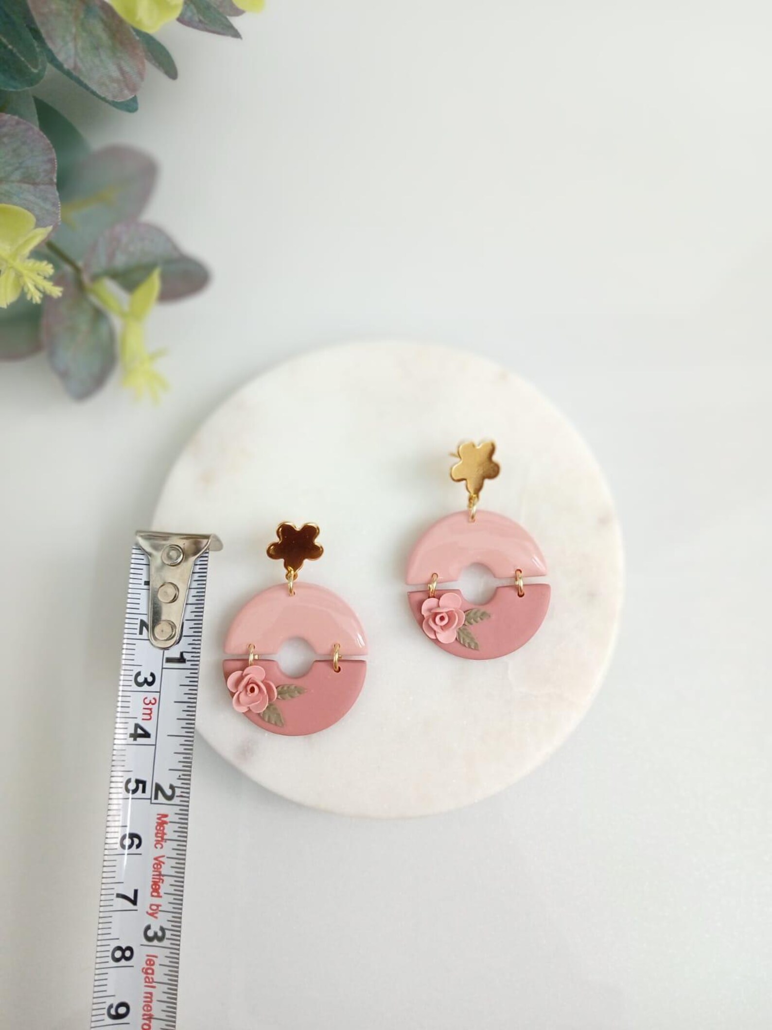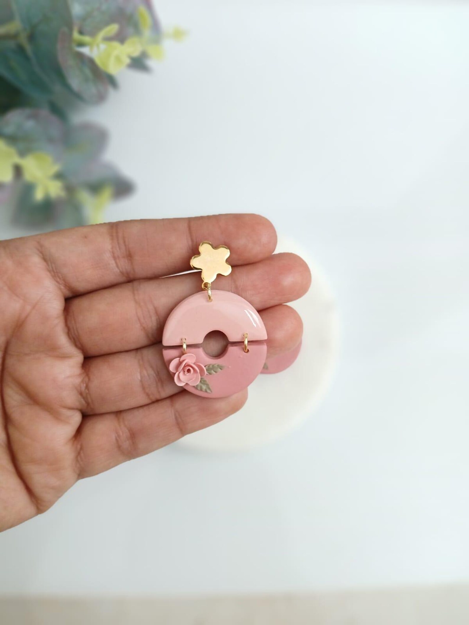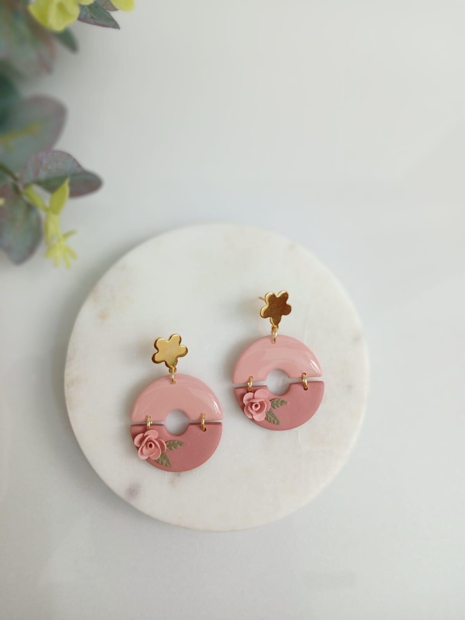 Add a soft touch of romance and feminine charm to your look with these handcrafted pink floral hoop earrings. Beautifully made from high-quality, lightweight polymer clay, each earring features a delicate pink circular design, accented with a tiny handcrafted rose and subtle leaf detailing.